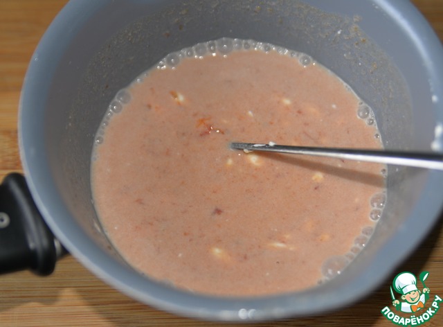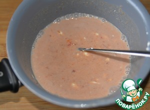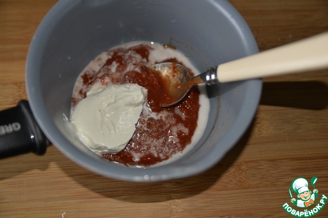Готовим соус. Смешиваем сметану и томатный соус, я готовлю сама. Можете брать томатную пасту, кетчуп или помидоры в соке.