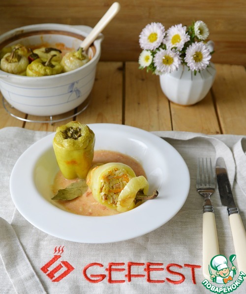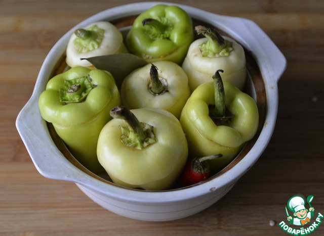 Накрываем "крышечками" - плодоножками, кладём острую перчинку для тех, кто любит поострее. Вставляем между перцами лавровый лист. Накрываем крышкой или фольгой. Ставим в нагретую до 200 градусов духовку, запекаем 40 минут. Через 20 минут после начала запекания крышку (фольгу) убираем, чтобы перчик запекся сверху.