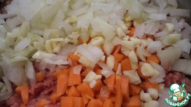 Добавить к фаршу мелко порезанные морковь, лук, чеснок, петрушку, молотые перец и кориандр, соль.