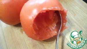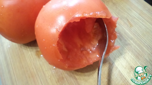 У помидора срезать нижнюю часть и ложкой вынуть мякоть.