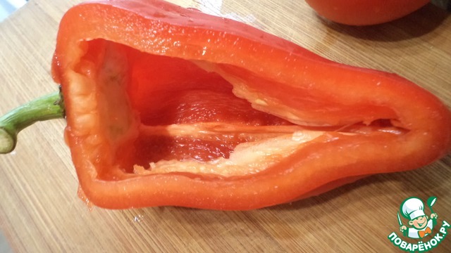 У болгарского перца отрезать боковую часть и вынуть семенную коробку, для этого сделать надрез внутри перца.