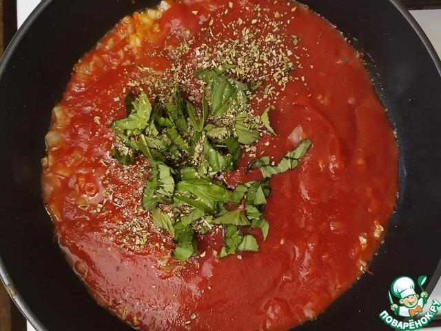 Зальём томатным соусом, добавим базилик, орегано. Готовить около 10 минут, до загустения соуса.