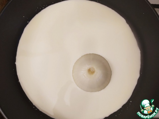 В сковороду нальём молоко и сливки, положим половину очищенного лука.
