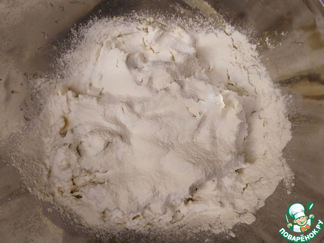 Начнём постепенно добавлять муку и замешивать тесто.