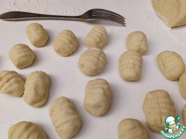 Каждый такой кусочек скатаем в овал и прокатим по зубчикам вилки, чтобы придать им ребристость. Это не просто для красоты. Такая форма позволит ньокки впитывать больше соуса.