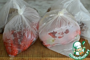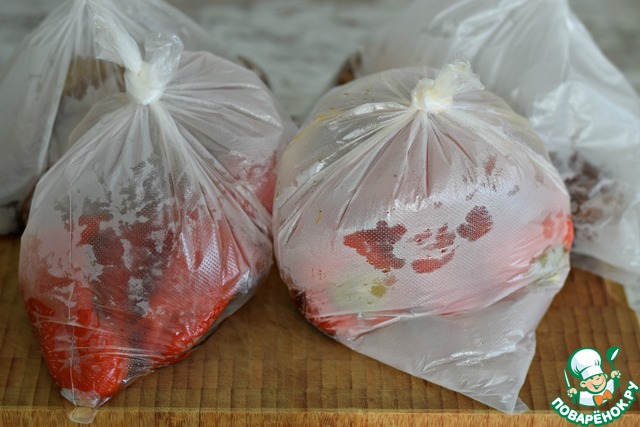 Готовые горячие овощи переложить в пакеты, пакеты плотно завязать. Полностью остудить овощи.