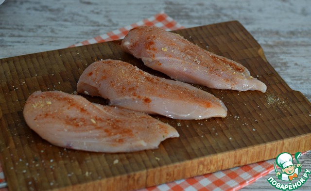 Филе обсушить бумажным полотенцем. Натереть солью, копченой паприкой и сушеным чесноком. -