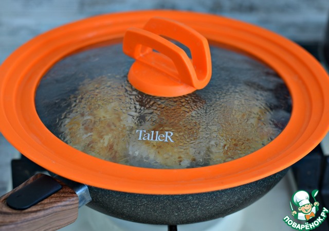 Затем влить в сковороду немного воды, 100-150 мл будет достаточно.