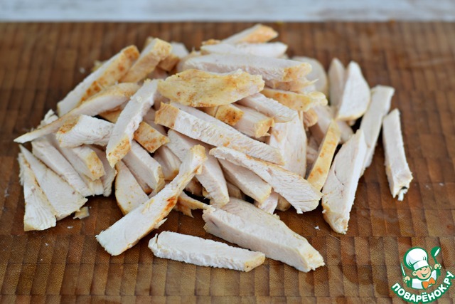 Куриное филе (грудка) отварить, запечь или обжарить. Как вам будет удобно.