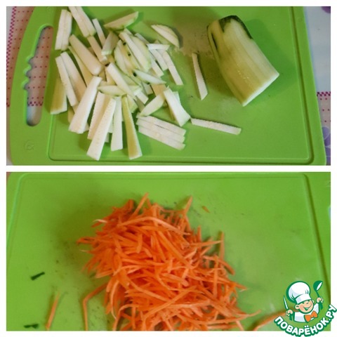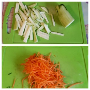Цуккини нарезать соломкой (шкурку можно и не очищать), морковь натереть на терке для корейской моркови.