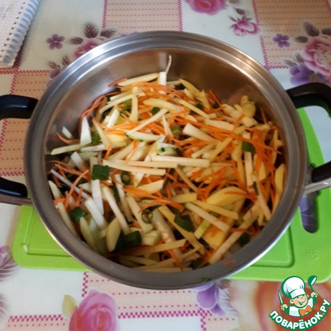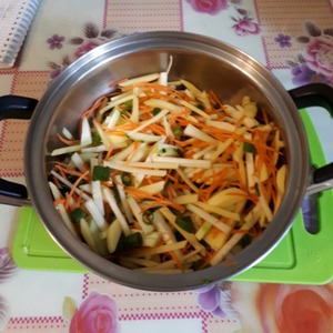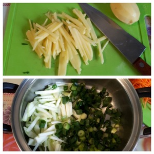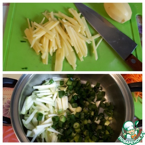 Картофель нарезать тонкой соломкой, нарезать зеленый лук.