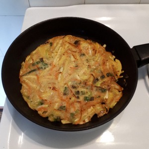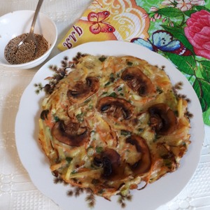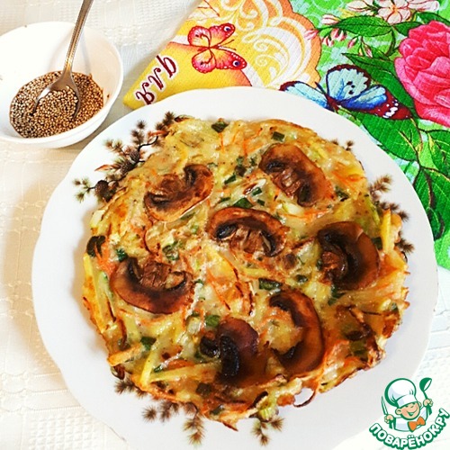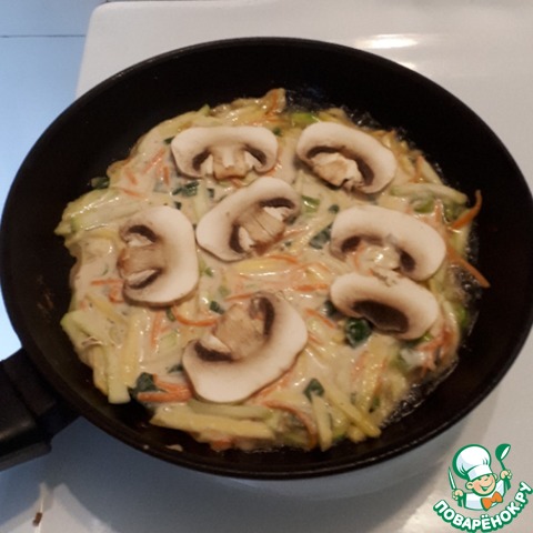 На сковороду налить 1 ст. л. растительного масла и выложить половину овощной массы, нарезать пластинками шампиньон и положить сверху. Жарить на среднем огне. Диаметр блина 18 см. Крышкой не накрывать!