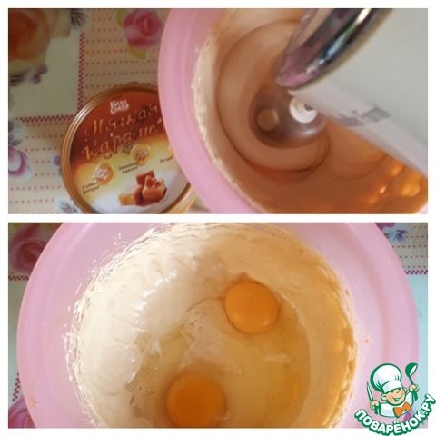 Взбить миксером сливочное масло ( или маргарин, спред) с карамелью и вареной сгущенкой примерно две минуты. Добавить яйца, хорошо перемешать. Если у вас нет карамели, возьмите только вареное сгущенное молоко (250 гр).