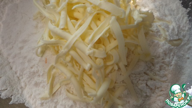 Холодное масло натереть на крупной терке, добавить к муке. Перетереть эту смесь в крошку и добавить соль.