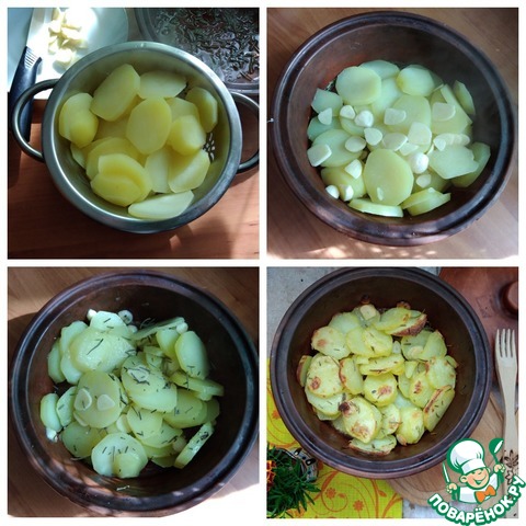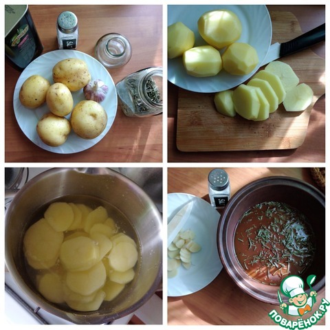 Готовим всё, что нам нужно для приготовления. Картофель чистим, моем, нарезаем "круглящами", толщиной примерно 0,5-0,7 см. Ставим варить картофель в подсоленную воду. С момента закипания варим 5 минут. Картофель можно запечь на протвине. Я возьму глиняную сковороду. Наливаем в неё масло оливковое и кладём розмарин. У меня сухой, хорошо пойдёт свежий. Чеснок нарезаем пластинками тонкими.