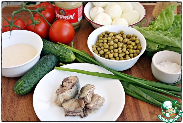 • Затем берём сервировочное блюдо, выстилаем листьями салата, сверху выкладываем огурцы с горошком и равномерно распределяем