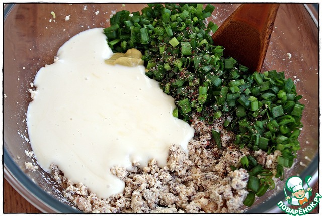 • Мелко нарезаем зелёный лук и отправляем к желткам, солим и перчим по вкусу. Добавляем горчицу и майонез.