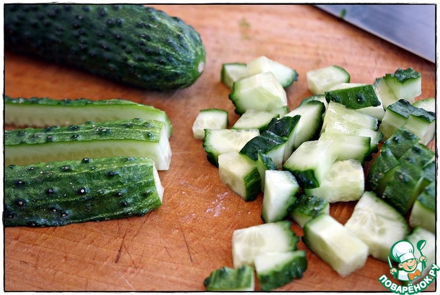 • Огурец разрезаем пополам, каждую половинку разрезаем на три брусочка и нарезаем мелким кубиком.