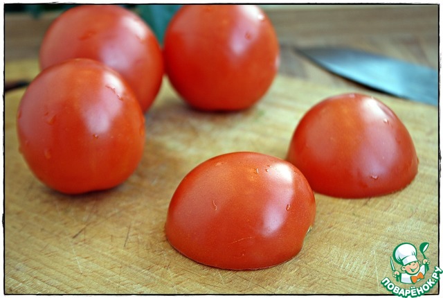 • Теперь помидорки разрезаем пополам. Помидоры берите небольшие, чтобы шляпка не была тяжёлой и Ваши мухоморчики не заваливались под тяжестью набок.