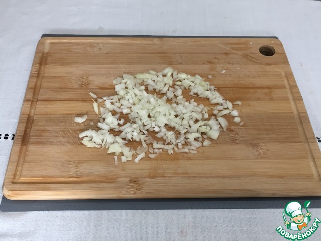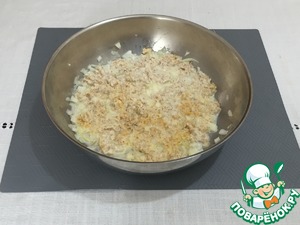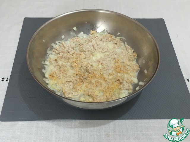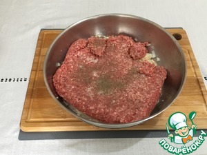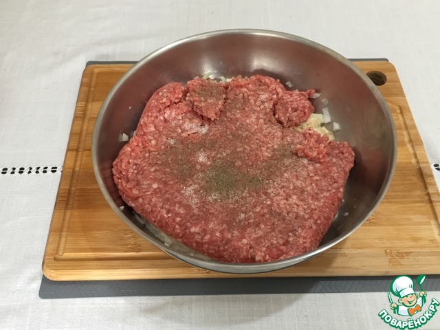 Добавляем молотый мясной фарш. Солим, перчим и хорошо перемешиваем массу.