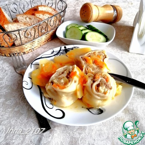 7. В глубокую сковороду выложить картофель (по желанию), нарезанный небольшими кусочками, оставшуюся зажарку, посолить по вкусу и сверху разложить рулетики срезом вверх.