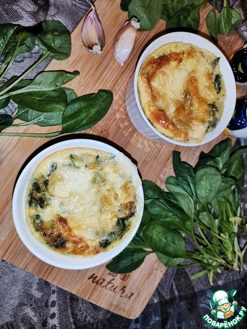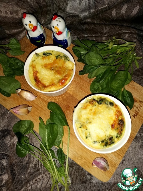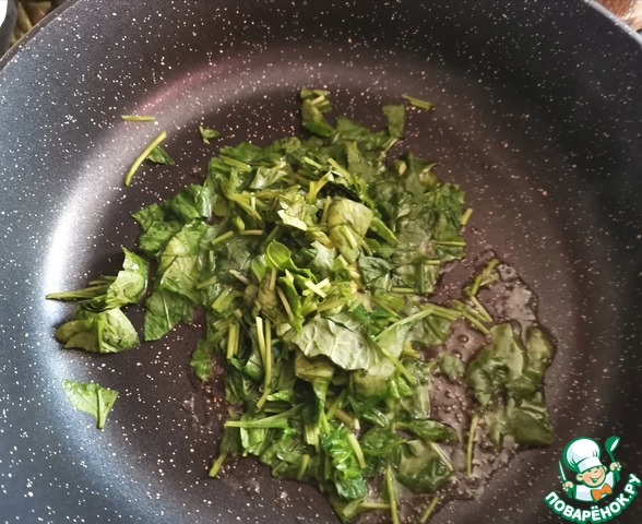 В сковороде разогреть сливочное масло, положить нарезанный шпинат, припустить на небольшом огне пару минут, разложить по формочкам.