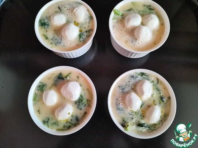 Взбить яйца с солью, перцем, молоком и манной крупной. И вылить в формочки поверх брокколи и шпината.