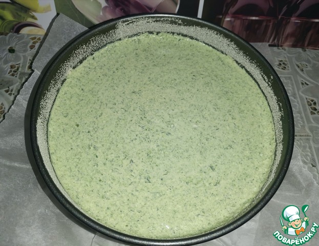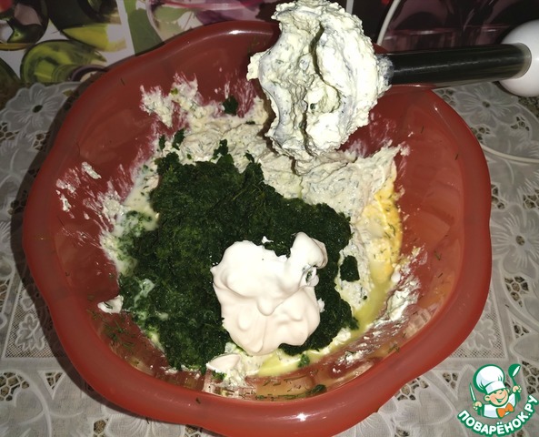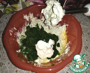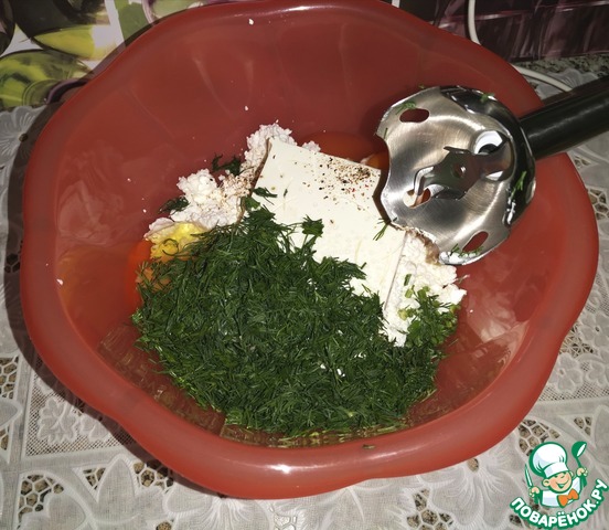 Сложить в чашу: мелко порезанный укроп, соль, чёрный перец, сахар, яйца, творог, брынзу и взбить блендером.