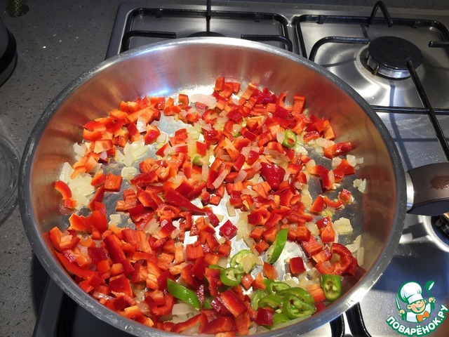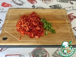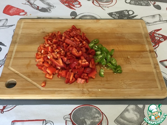 Тем временем нарезаем болгарский перец мелким кубиком. Острый перец нарезаем кружочками.