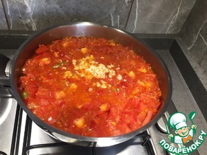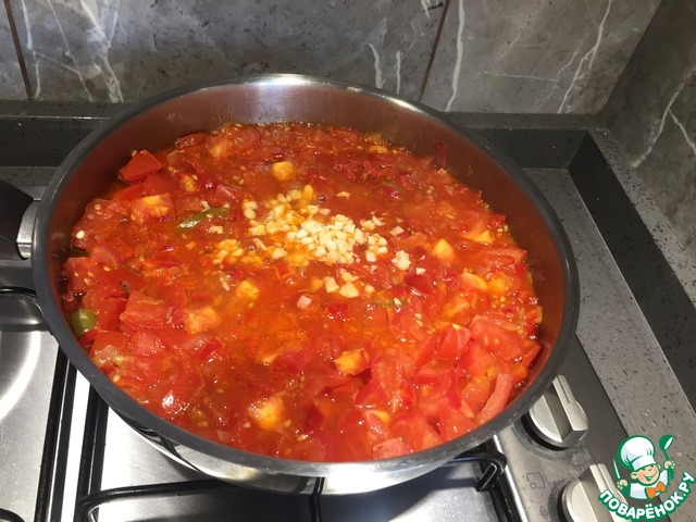 Затем всыпаем чеснок и одну ст ложку яблочного уксуса. Все хорошенько перемешиваем и через 2-3 минуты снимаем с огня. -