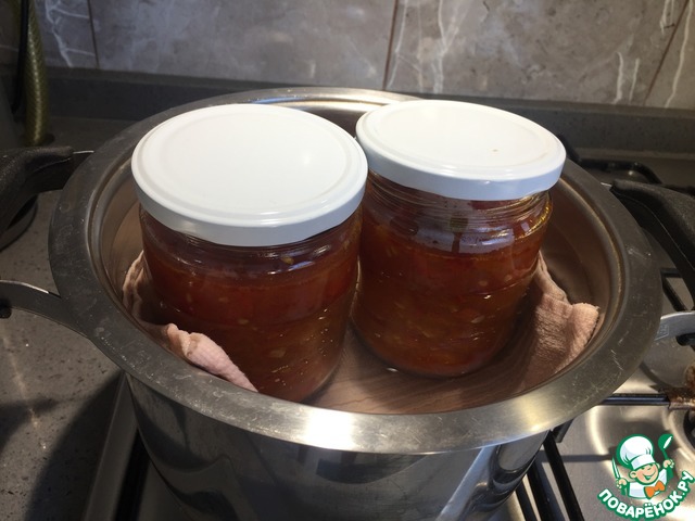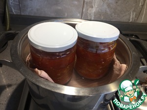 Выкладываем полученную массу в стрелизованные баночки. Для стерилизации я кладу их в духовку вместе с крышками на 20 минут при температуре 150 градусов,