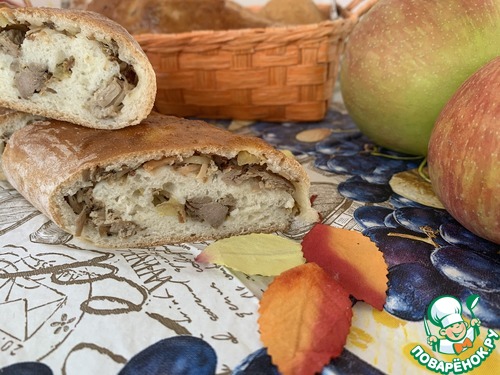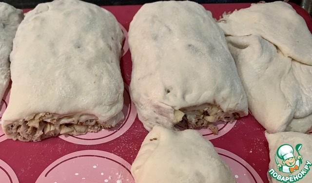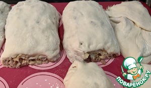 Равномерно выложите половину начинки, края смажьте яйцом и плотно заверните в рулет, разрежьте на три части. Также заверните второй рулет.