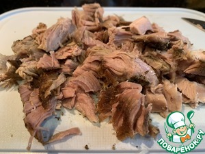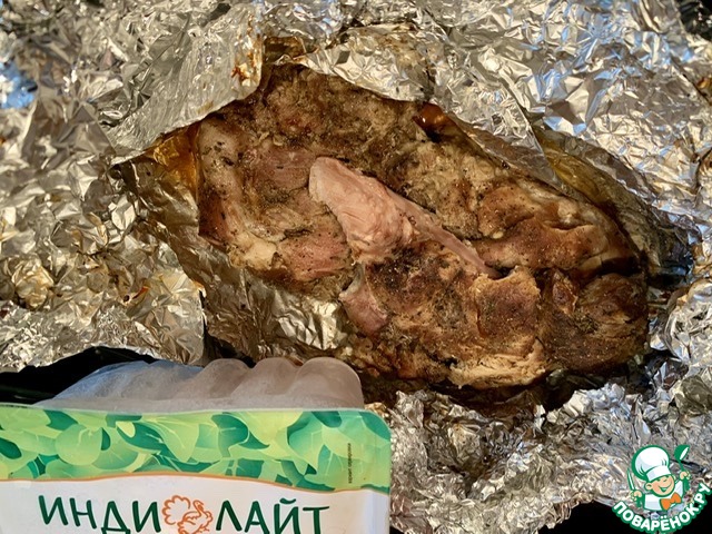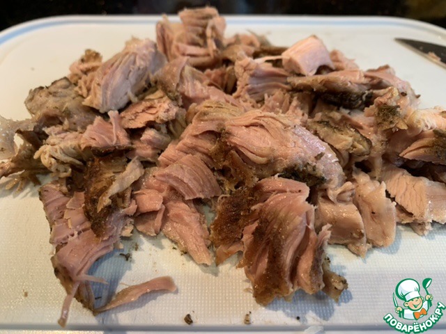 Бедро индейки нужно предварительно запечь. Я обычно ставлю запекаться на ночь. Бедро индейки посолите и поперчите, приправьте итальянскими травами, хорошо заверните в фольгу и запекайте при температуре 200 градусов 2 часа.