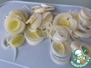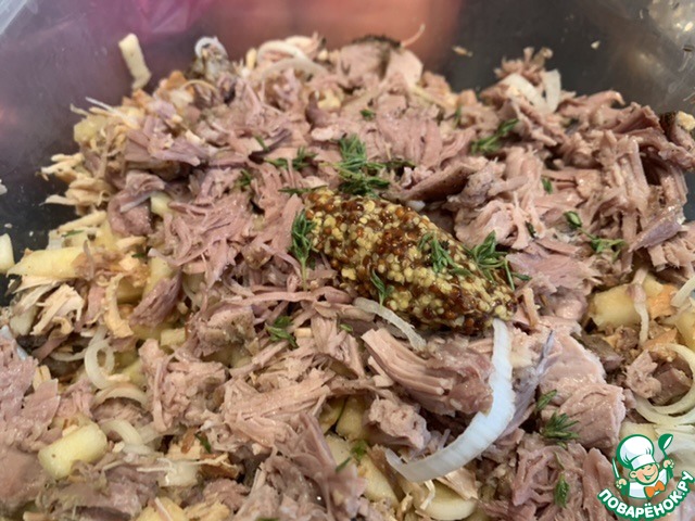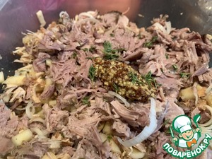 Смешайте в миске индейку, яблоки, лук-порей, горчицу и листики тимьяна.