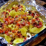 Отварить до готовности в подсоленной воде, слить воду и перенести горячие картофелины в форму для запекания. Я поместила на фольгу и сделала из неё типа бортиков.