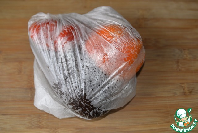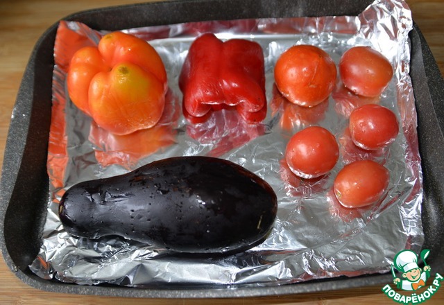 Берём овощи в cоотношении 1:1:1. Моем. На противень кладём фольгу, на неё баклажан, перцы, помидоры. Баклажан протыкаем вилкой несколько раз. Ставим в духовку на 200 градусов на 40 минут.