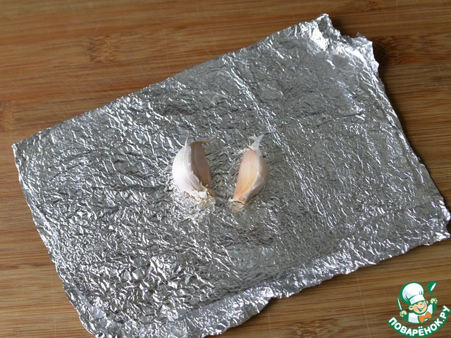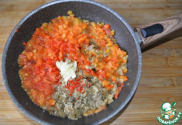 Кладём измельчённые овощи на сковороду, добавляем порезанный жгучий перец, выдавливаем из оболочки запечённый чеснок.