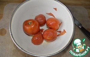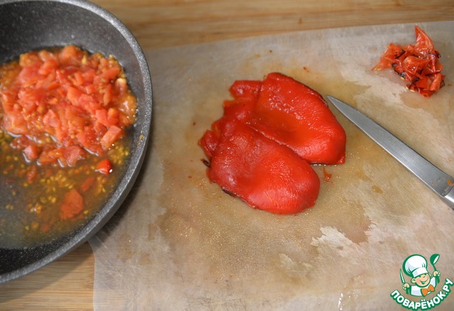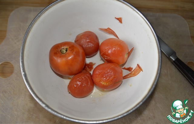 Снимаем с перцев, помидоров и баклажан кожицу и мелко режем ножом. Можно, конечно, измельчить блендером, но балканцы не понимают такую "кашу".