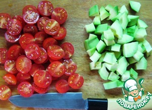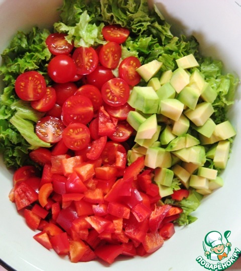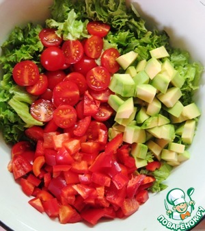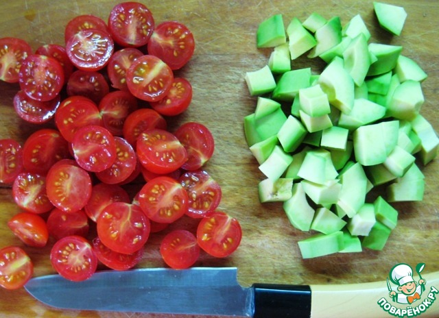 Помидоры черри разрезать пополам, авокадо очистить и нарезать небольшими кусочками.