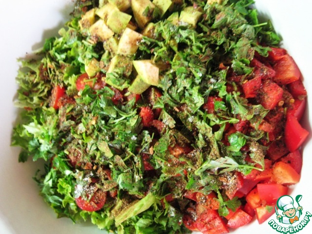 Приправить солью и смесью перцев по вкусу, добавить измельченную зелень петрушки.