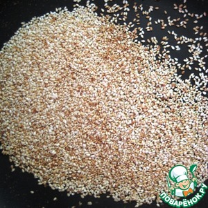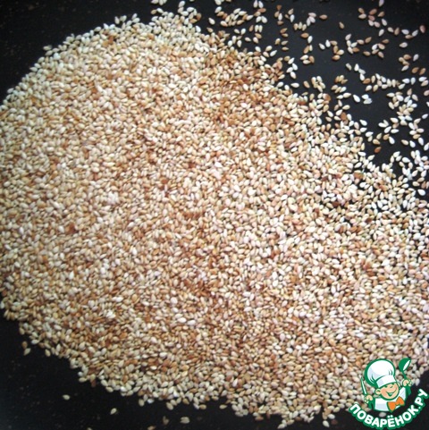 Кунжут прокалить на сухой сковороде до золотистого цвета, снять с огня, дать остыть.