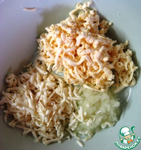 В отдельную посуду натереть репчатый лук, брынзу и плавленный сыр.