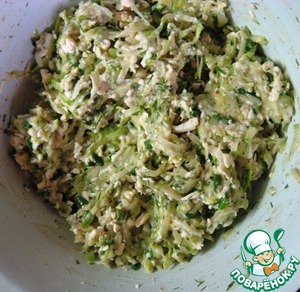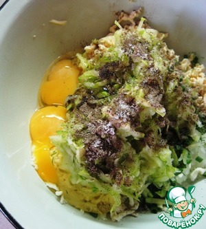 Натертый кабачок хорошо отжать руками от жидкости и добавить к остальным ингредиентам.