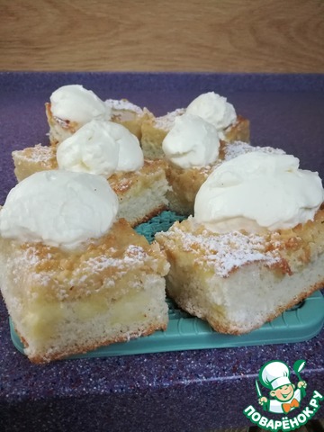 Выпекать в разогретой духовки до 200С 20мин. до легкого зарумянивания (следите за своей духовкой). Горячий пирог залить сливками.