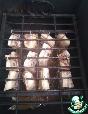 У меня стационарная коптильня, на дно кладем фольгу, для сбора капающего жира, насыпаем опилки вишни или черешни ( так же можно яблоневые или грушевые опилки). Подвешиваем подготовленные кусочки, накрываем крышкой и поджигаем печь. Коптим 1-1,5 часа, в зависимости от размера кусочков сала.