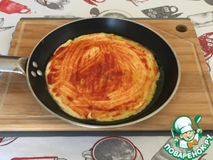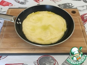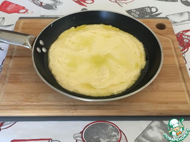На сковороду льем оливковое масло для жарки. Для такого количества теста я беру сковородку диаметров 25 см. Затем выкладываем тесто на поверхность и хорошенько его разравниваем.
