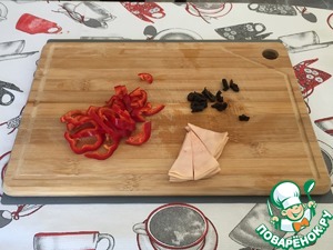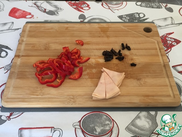 И далее подготовим начинку. Я буду использовать болгарский перец, нарежу его кружочками. Также возьму колбаску, ее нарежу треугольничками. И возьму оливки, также их нарежу кружочками. Начинку вы можете использовать абсолютно любую, которая вам по вкусу.