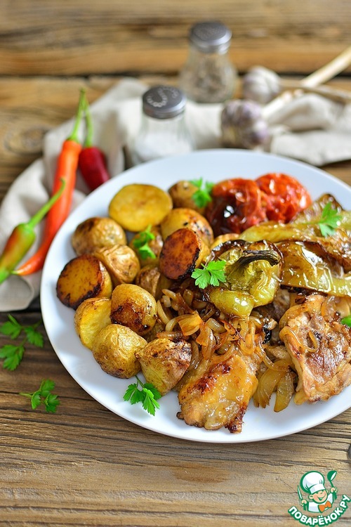 Картофель хорошо промыть, не чистить, разрезать пополам, перец - на 4 части, помидоры - целиком.