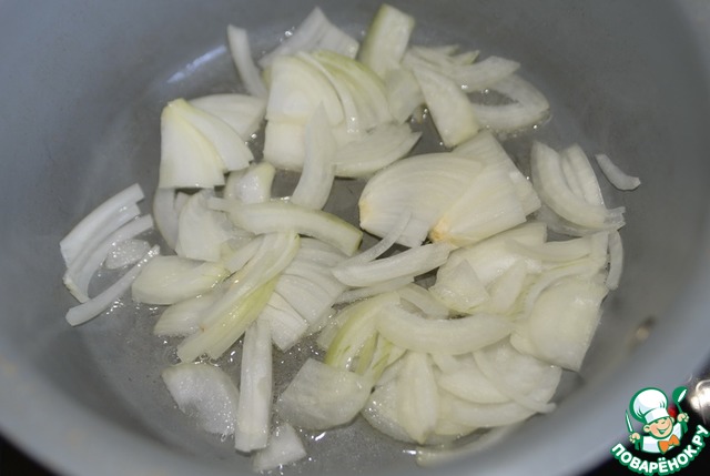 Берём казан, или сковороду, или сотейник. Нагреваем, наливаем масло, кладём лук и подрумяниваем до золотистости.