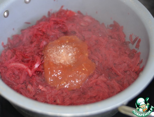 Кладём свёклу к луку и тушим на среднем огне 15 минут.